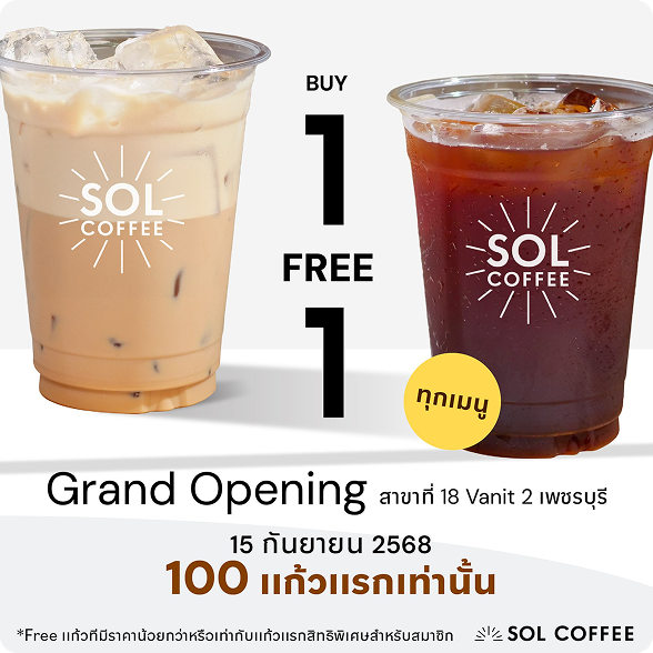 ☀️🎊 SOL Coffee's 18th branch is now open at Vanit 2 Building on Petchburi Road. 🎊☀️ Celebrate the grand opening of SOL Coffee with a buy-one-get-one-free promotion for the first 100 cups. Exclusively for SOL Coffee members who purchase at the Vanit 2 branch on opening day only! 📣 September 15, 2025 📣 🕙 Open Monday - Friday: 7:00 AM - 4:00 PM Saturday: 8:00 AM - 5:00 PM (Closed Sundays) 🛵 Grab Food: Click here >> https://grb.to/4jS4cxO