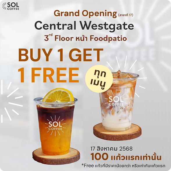 SOL Coffee's 17th branch is now open at Central Westgate, 3rd floor, in front of Foodpatio. 🎊☀️ Celebrate the grand opening of SOL Coffee with a buy-one-get-one-free promotion for the first 100 cups! This offer is valid for one day only. 📣 August 17, 2025 📣 See you there! 📍 SOL Coffee - Central Westgate, 3rd floor, in front of Foodpatio 🕙 Open daily: 10:00 AM - 9:50 PM 🛵 Grab Food: Click here >> https://grb.to/4jS4cxO