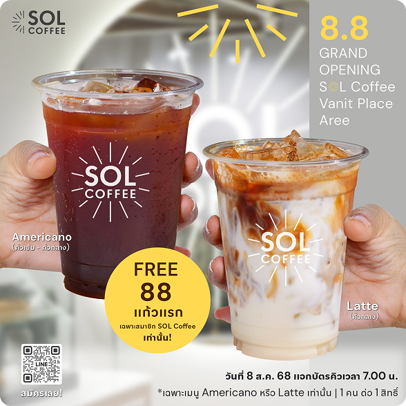 This 8.8, celebrate the grand opening of SOL Coffee Vanit Place Aree's 16th branch with a free giveaway for the first 88 cups! 🎉 Special for SOL Coffee members: Get your first 88 cups free on any Americano (medium roast | dark roast) or Latte (medium roast). Sign up now >> https://lin.ee/AalQsDB See you on August 8, 2025. Tickets will be distributed at 7:00 AM. 📍 SOL Coffee: Vanit Place Aree, 1st Floor See you there! Terms and Conditions for the First 88 Cups Free! - SOL Coffee members only. - Free giveaway for only Americano (medium roast | dark roast) or Latte (medium roast). - Tickets will be distributed at 7:00 AM at SOL Coffee: Vanit Place Aree, 1st Floor. - Only for those who receive tickets 1-88. - Terms and conditions apply.