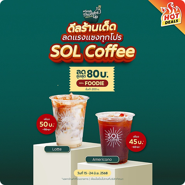 Cool shop deal. Super discount. Pamper your eaters with a worthwhile deal from SOL Coffee shop. Menu Americano Only 45 baht left. * from 65 baht. Latte menu Only 50 baht left. * from 70 baht. Further discount up to 80 baht. * Enter the code FOODIE Minimum 200 baht. Deliciousness guaranteed by #GrabThumbsUp Order now on GrabFood Date 15 - 24 June 2568 *Terms and conditions are also applicable.